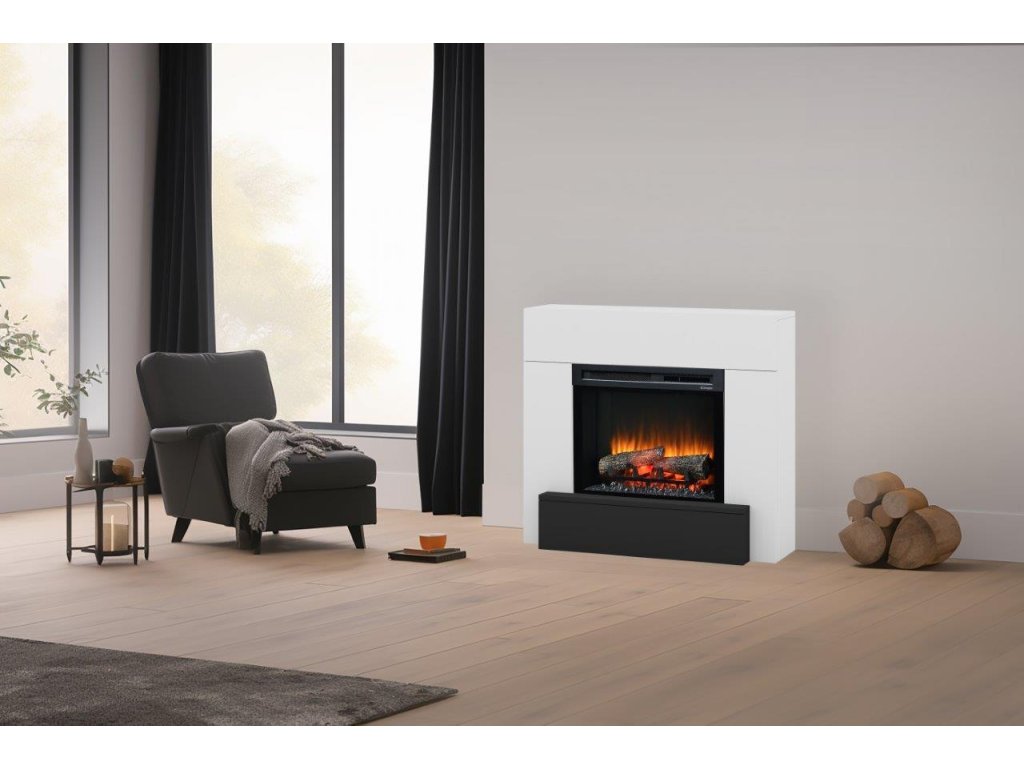 Krb s efektom plameňa Optiflame® LED a obstavbou v bielej farbe. Ohnisko je tvorené polienkami s možnosťou vykurovania pomocou ventilátora. Plameň v 3 farbách má 3 stupne jasnosti a 3 stupne rýchlosti.